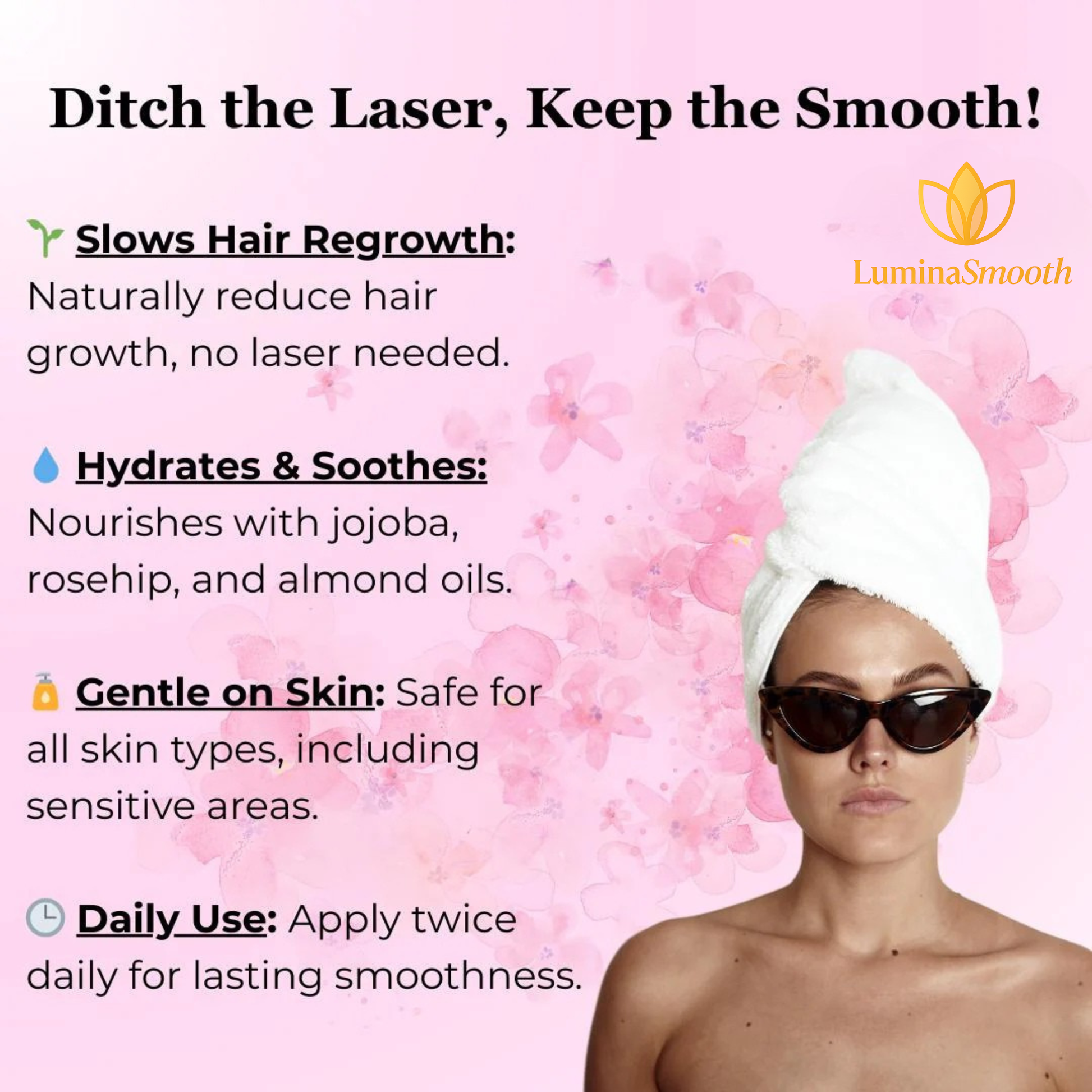 LuminaSmooth Cyperus Rotundus Oil is formulated with natural flavonoids known for their potential anti-androgenic properties. Androgens are hormones that stimulate hair growth in certain areas. By gently helping to limit these hormone effects, the oil may slow hair regrowth and reduce hair thickness over time — revealing smoother, softer skin with consistent use.